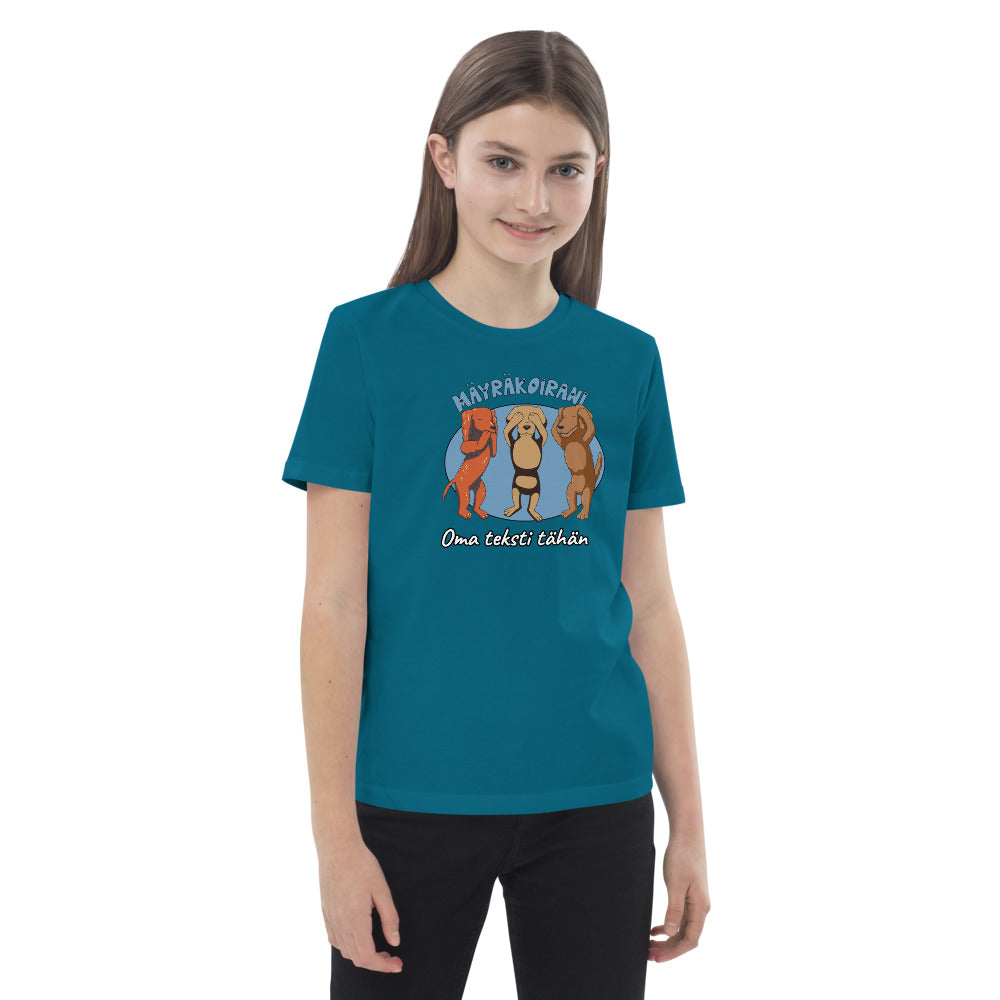 Luomu puuvillaa Lasten ja Nuorten T-paita FB Mäyräkoirani omalla tekstillä